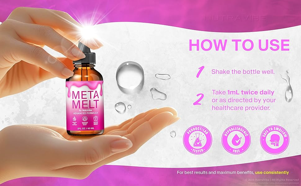 MetaMelt is a liquid dietary supplement - drops you take under your tongue twice a day, morning and evening. The sublingual delivery method (under the tongue) is designed to support absorption, though effectiveness varies from person to person.